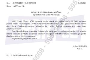 Ordu Valiliği Gençlik ve Spor İl Müdürlüğü tarafından Gençlik ve Spor Bakanlığı’na gönderilen resmi yazıda 19 Eylül Stadyumu’nun Cumhurbaşkanı talimatı ile Millet Bahçesi yapılması için yıkıldığı ibaresi yer alırken: ”Gazi Mustafa Kemal Atatürk’ün Ordu’ya geliş tarihi olan ve yıkılan stadyumda 1952 yılından itibaren kullanılan 19 Eylül Stadyumu isminin yeni yapılan Ordu Stadyumu’na verilmesi için gerekli form yazımız sunulmuştur” açıklamaları da yer aldı.
